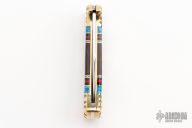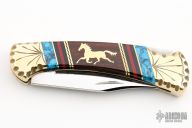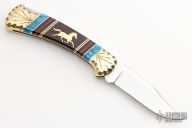 This Buck Model 112 knife Customized by David Yellowhorse is a lock back with brass bolsters, ironwood, turquoise, jasper and brass spacers. Satin finished blade. Strong lock up. Excellent condition.