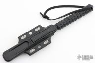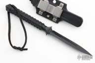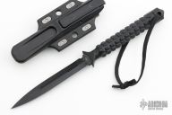 Tactical black ADO made from a single steel billet. Black double edge dagger blade with textured handle. Blade is 5/32" thick and 17/32" deep.  Removable end cap with small storage area. Sheath with belt clip. Has some light sheath marks, otherwise excellent condition.