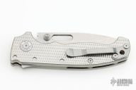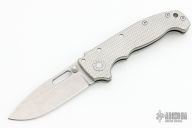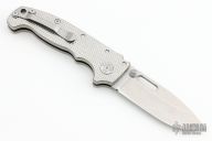 This AD20S by Andrew Demko features a stonewash finish drop point blade with notched thumbrest, thumbhole and dual thumbstuds. The handle has an all Titanium frame with a tip up stainless steel clip and "Shark" lock release on the spine.  Comes with original box. Excellent condition.