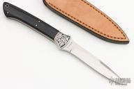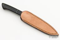 This Boot Knife by Ray Covers features a hand rub satin finished drop point blade with false top edge, full tapered tang construction, .138" blade stock and .660" blade depth. The handle has engraved and dovetailed stainless steel bolsters, black paper micarta scales with red liners.  Includes a brown leather sheath. Excellent condition.