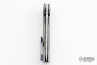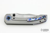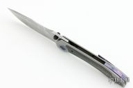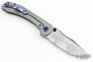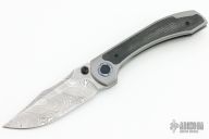 This Raptor by Brian Brown features a Damasteel blade with dual thumbstuds and notched thumbrest. The handle has a bead blasted titanium frame with a black canvas micarta inlay, MokuTi pivot collars, tip up clip and backspacer. Comes with a zippered case, original titanium hardware and COA. Excellent condition.