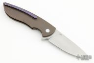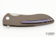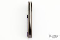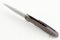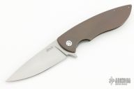 This Sting Flipper by Herman Knives features a tumbled blade and flipper. The handle has a milled and anodized titanium frame, titanium liner and tip up clip and carbon fiber backspacer. Nice detent, lockup and blade seating. Rides on bearings.  Comes with COA, zipper case, and extra hardware. Excellent condition.