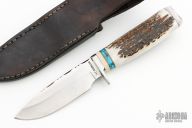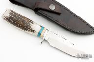 This knife by Frank Corum features a satin finished blade with fileworked spine, .139" blade stock and 1.238" blade depth, hidden tang construction. The handle has a stainless steel guard, stag grip and butt, ivory paper micarta/brass/turquoise spacers. Comes with a black leather sheath. Has a few light scratches, otherwise excellent condition.