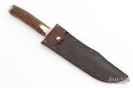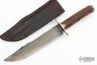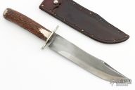 This Bowie by Willard Smith features a clip point blade with false top edge, .210" blade stock and 1.448" blade depth, hidden tang construction. The handle has a nickel silver guard, stag grip, pewter butt cap. Comes with a brown leather sheath. Has some light scratches and patina, otherwise excellent condition. Stamped WS on the ricasso.