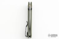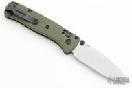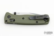 The Mini Bugout features a drop point blade with stonewash finish. It's a manual opener with ambidextrous thumb studs. This AXIS lock has a green g10 frame and black hardware, a black mini deep-carry pocket clip, and a lanyard hole. Comes with original box and soft pouch. Also comes with original orange scales and hardware. Excellent Condition.