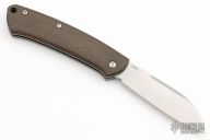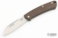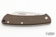 This Benchmade Proper slip joint folder is a modern take on a classic gentleman's knife design. This model features Green Canvas Micarta scales paired with a stonewashed sheepsfoot blade made from premium CPM-S30V stainless steel. Skeletonized stainless steel liners offer reduced weight for comfortable everyday carry in a pocket or pack. A lanyard hole in the handle accommodates key ring or lanyard attachment. Comes with original box and papers. Excellent condition.