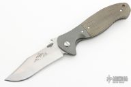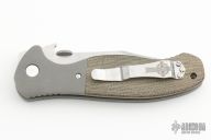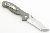 This Customized Patriot features a tumbled clip point recurve blade with a monster thumbdisc and wave feature, also has notched thumbrest. The handle has titanium bolsters, green canvas micarta scales and bead blasted titanium liners.  Stainless steel Cletic clip, tip up carry. Comes with original box and the original black G-10 scales.  Light scuffs/scratches are visible otherwise the knife is in Excellent Condition.