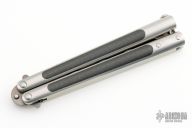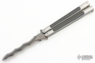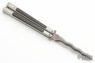 This RARE balisong features a black double-edged kris blade with scalpel edges, this knife has no safe handle for knife minipulation. The integral handles are satin finished titanium with carbon fiber inlasy and a spring latch. #47 of 50 on blade. Comes with a padded zippered case. Excellent condition. VERY RARE.