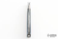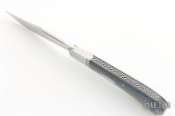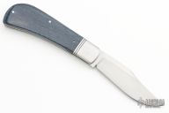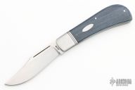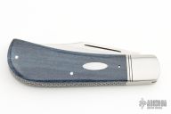 This Lanny's Clip by Phil Jacob features a hand rub satin finished blade with nail nick. The handle has threaded stainless steel bolsters, blue swordfish bill covers with a stainless steel oval escutcheon, stainless steel liners and spring with Roman Knot filework that runs all the way down the spring. Liners also have filework on the spines. Has half-stop, flush in all positions.  Comes with zippered case and COA.  Excellent Condition.
