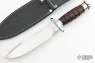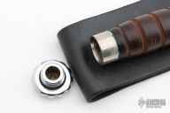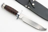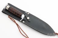 This Survival knife by Hackman features a spear point blade with sawteeth on the spine, .248" blade stock and 1.509" blade depth, hidden tang construction. The handle has a stainless guard, stacked leather hollow handle and removable stainless butt cap, has storage area in handle. Comes with a black leather sheath. Has some light scratches, otherwise excellent  condition.