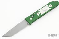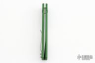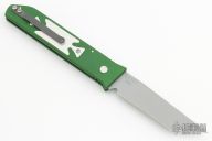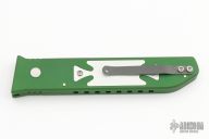 This Jammer by Rob Dalton features a bead blast chisel ground tanto blade and a green aluminum handle with an aluminum inlay. Bead blast titanium clip, tip up carry. Strong and fast coil-spring opening. Numbered 0173 on frame. Has a couple light scuffs, excellent condition.