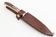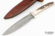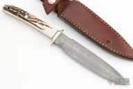 This Dagger by Charles Ochs features a Damascus double edged blade with .150" blade stock and 1.224" blade depth, full tapered tang construction. The handle has a nickel silver guard, stag scales with red liners and nickel silver pins, lanyard hole at the butt. Comes with a brown leather sheath. Excellent condition. Comes with a zippered case.