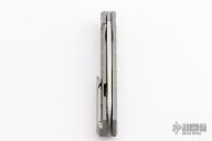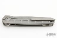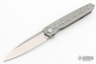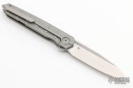 This Cypher Mini Bright by Deryk Munroe features a tumble finished blade with fullers, a notched thumbrest and flipper. The handle has a tumbled titanium frame, a matching titanium backspacer with lanyard hole, titanium tip up clip with hidden screws, and stainless steel lockface insert/internal over travel stop. Nice detent, lockup and blade seating. Rides on caged ceramic Si3N4 bearings. Comes with original packaging. Excellent condition.
