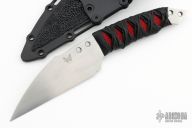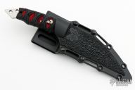 A unique fixed blade Snody design in the Japanese genre of form and function. The polished chisel ground blade flows into a cord wrapped handle with red colored ray skin. Also in the handle is a skull and bone design menuki. And for carry, a molded sheath is done with a ray skin texture to compliment the knife. Notching on thumbrest and back of tang. Marked "First Production Run 870/1000". VERY HARD TO FIND. Comes with kydex sheath. .209" blade stock, 1.569" blade depth. Has a few light scratches, otherwise excellent condition.