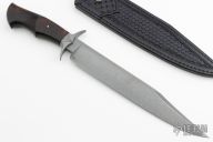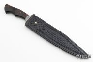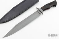 This Bill Bagwell Inspired Bowie by Milan Mozolic features an acid tumble finished W5 steel blade with false top edge, .253" blade stock and 1.544" blade depth, hidden tang construction. The handle has an acid tumbled carbon steel guard with engraved embellishment, dark Ironwood burl grip with a single steel domed pin. Comes with a hand tooled black leather sheath. Comes with COA. New from maker! Comes with cloth pouch.