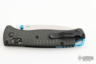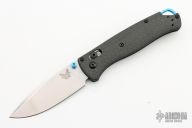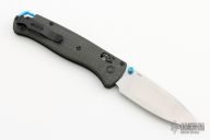 The 535-3 Bugout knife is built with a carbon fiber handle and a satin finished blade with a plain cutting edge.