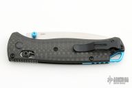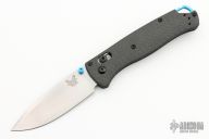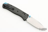 The 535-3 Bugout knife is built with a carbon fiber handle and a satin finished blade with a plain cutting edge.