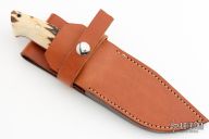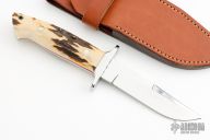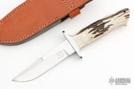 This Chute Knife by Tim Hartman features a mirror polished blade with sharpened top edge, .197" blade stock and .993" blade depth, full tapered tang construction. The handle has mirror polished stainless steel guard, stag scales with red liners, nickel silver pins and a lanyard hole. Comes with a brown leather sheath and a zippered case. Has a few light scratches, otherwise excellent condition.