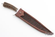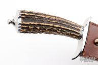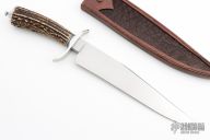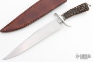 This Bowie by Journeyman Smith Sandro Boeck features a hand rub satin finished blade with false top edge and a visible temper line, .355" blade stock and 1.729" blade stock, hidden tang construction. The handle has a polished stainless steel guard, stag grip, stainless steel butt, fileworked stainless steel spacers. Comes with a brown leather sheath with exotic skin inlay. Sheath is dated 2015. Excellent condition. Comes with a zippered case. This knife was part of his Journeyman Smith Test Set, and they were published in the November 2015 issue of Blade Magazine after he achieved Journeyman Smith status. Comes with a copy of the front page of the magazine and the page it was featured on!