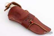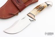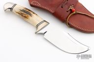 This Bowie/Skinner by Bernard Sparks features a mirror polished upswept blade with sharpened top edge, .242" blade stock and 1.886" blade depth, hidden tang construction. The handle has a nickel silver guard and butt cap, stag grip with black and nickel silver spacers. This knife feels great in the hand - well balanced and fitting. Excellent condition. Comes with an original brown leather sheath.