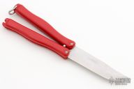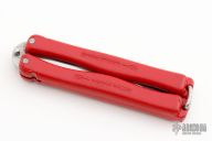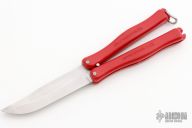 This Vintage CIA Balisong by Hackman has a satin finished stainless steel clip point blade. Handle is red polymer with O-latch at butt. Has some scratches, otherwise good condition.