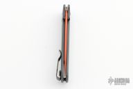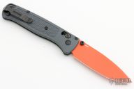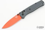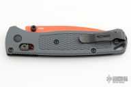 The 535 Bugout knife is built with a grey FRN handle and an orange cerakoted blade with black hardware.