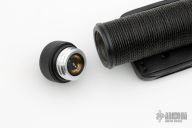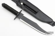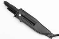 This knife features a two-tone blade with black center and mirror polished grinds, 14 saw-teeth on blade spine and sharpened top edge, .258" blade stock and 1.825" blade depth, hidden tang construction. The handle has a black stainless steel double guard with flat and Phillips head screwdrivers, hollow cord wrapped handle, and aluminum removable butt cap with a compass and an O-ring to make it waterproof. Comes with black leather sheath with a diamond sharpener in the sheath and a Lile zippered case. The blade is stamped 067. Designed by Jimmy Lile and made by Vaughn Neeley. New From Maker!