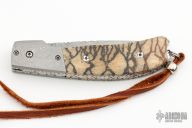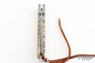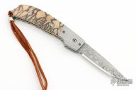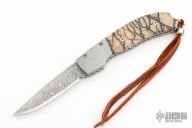 This Bolster Release Auto by Mike Whiskers Allen features a "Rose" Damasteel blade with fileworked spine. The handle has Chad Nichols "Bullseye" Damascus dovetailed bolsters, tiger coral scales, fileworked stainless steel liners and backspacer. "Whisker 01-08" inside backspacer. Nice action, lockup and blade seating. Comes with zippered case and COA, excellent condition.