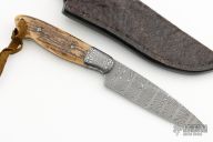 This Hunter by Thomas Haslinger features a Mike Norris Damascus blade with fileworked spine and tang, .139" blade stock and 1.059" blade depth, full tang construction. The handle has G Weinand Mosaic Damascus dovetailed bolsters, mammoth ivory scales with fileworked and gold inlaid pins, lanyard hole at the butt. Comes with a brown leather sheath with snake skin overlay. Excellent condition. Comes with a zippered case.