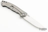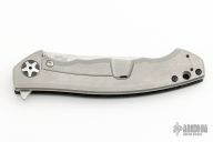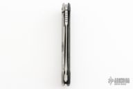 This 0452CF Sinkevich designed folder from Zero Tolerance features a drop point blade with swedge. The blade has tumble finished flats and satin grinds. The handle has a carbon fiber scale on the non lock side, and a tumbled finish titanium frame lock on the other, clip is missing. Serial #17875. Excellent Condition.