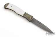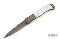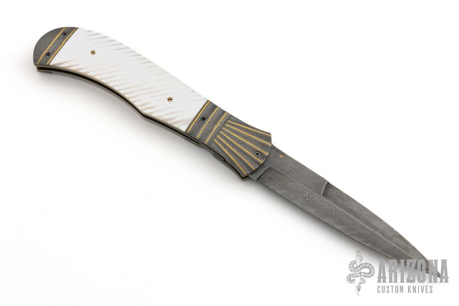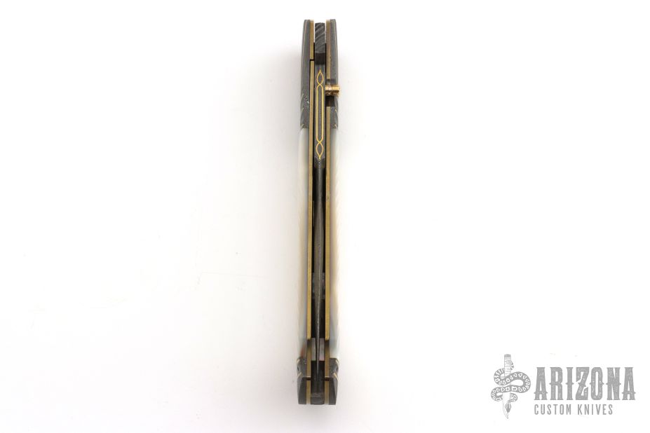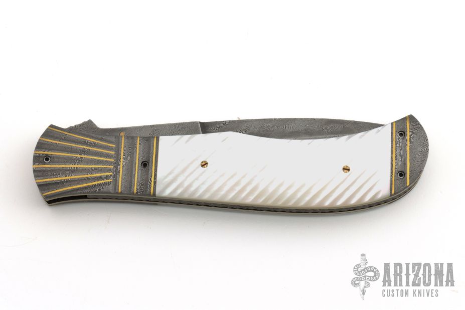 "I have been a fulltime maker since 1993 and am proud to be a voting member of the Knifemakers Guild. Most of my work is in embellished locking folders, with an occasional art fixed blade. In 1994 I began doing my own engraving and started making Damascus in 1999. I prefer natural handle materials such as mother of pearl, fossil Ivories and stone. Blade steel is my Damascus (unless otherwise noted) or one of the high quality stainless steels currently available. The embellishments I offer are engraving, gold inlay, mosaic pearl inlays, file work, carving and solid 14K gold screws and thumb studs that I make in shop."