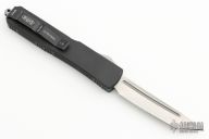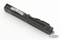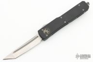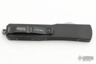 This Ultratech OTF automatic from Microtech features a satin finish Tanto edge blade with swedge and fullers. The handle has a black anodized aluminum handle with stainless steel thumb slide and tip down clip. Dated 02/2007 with a serial number of 01646. Has some scuffs and scratches on the frame and clip, and the glass breaker appears ground down. Great condition otherwise.