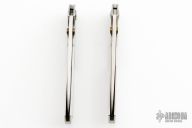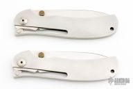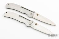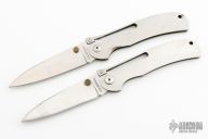 These One Handed Folder by A.G. Russell features a satin finished drop point blade with dual brass thumbstuds. The handle is comprised of an integral steel frame with lanyard hole on pommel. One has scuffs and scratches and has been resharpened, the other just has a few light scratches.