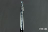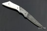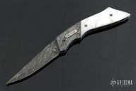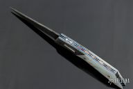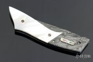 This custom automatic features a George Werth Damascus blade and MOP scales. Abalone inlay on the rockerbar. Extensive file work on frame, blade spine, backspacer, and anodize finish titanium liners. Leaf spring. Beautiful materials. Has a couple light scuffs and a small chip in the pearl on the underside of one of the scales, hard to see and notice, excellent condition otherwise.