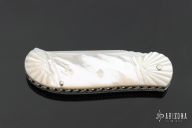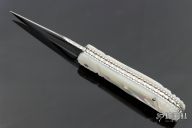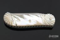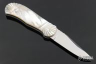 This Palm Release Auto by Ken Steigerwalt features a mirror polished clip point blade with fileworked spine. The handle has fluted mother of pearl scales, fileworked nickel silver liners, fileworked stainless steel backspacer. Nice action, lockup and blade seating. Has a few light scratches, otherwise excellent condition.