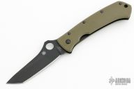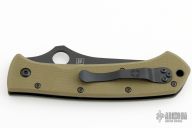 This Bob Lum designed folding knife by Spyderco features a black tanto style blade marked with the Lum Logo. Stainless steel liners. Textured green G-10 scales, tip up stainless steel clip. Comes with original box and papers. Nice detent, lockup and blade seating. Excellent condition.