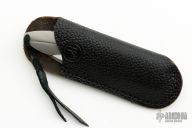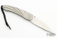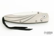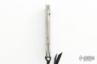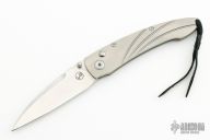 This B07 button lock folder by William Henry features a hand rub satin finish blade with single thumbstud. Has a titanium handle with lanyard hole and lanyard. Comes with original black leather sheath with clip. Has some light scratches, otherwise excellent condition. Comes with a zippered case.
