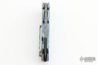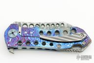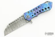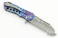 This Moab by Darrel Ralph features a Chad Nichols Damascus blade with fileworked spine and notched flipper. The handle has a MokuTi frame, Damascus backspacer with lanyard bail, tip up Damascus clip, anodized titanium pivot. Excellent condition. Nice detent lockup and blade seating. Comes with a zippered case.