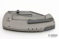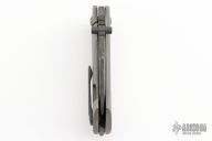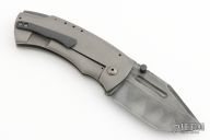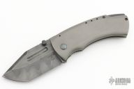 This FMUK by Jonathan McNees features a hollow ground blade with dual thumbstuds, notched thumbrest, fullers and a hamon. The handle has a tumble finished titanium frame, dimpled pivot and a black titanium tip up pocket clip. Nice detent, blade seating and lockup. Has a couple light scuffs, otherwise excellent condition. Comes with a Velcro case.