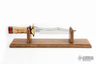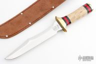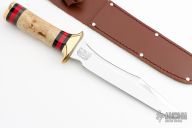 This fighter by Craig Bigler features a mirror polished blade with sharpened top edge, .222" blade stock and 1.295" blade depth, hidden tang construction. The handle has a brass guard and butt, oosic grip, buffalo horn and red spacers. Has some light scratches, otherwise good condition. Comes with a wooden display stand, a zippered case. Comes with a brown leather sheath, it is not original, but it fits.