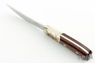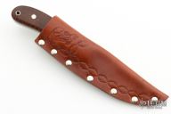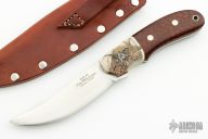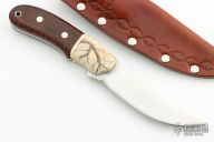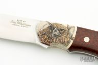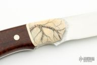 The Raptor by Jim Whitman features a satin finish blade with jeweled ricasso, .144" blade thickness and 1.150" blade depth, full tang construction. The handle has dovetailed fossil walrus ivory bolsters, snakewood scales, stainless steel pins and lanyard hole. The bolsters have been scrimshawed by Mary Mueller Wood. Comes with a hand tooled brown leather sheath. Excellent condition. Comes with a COA.