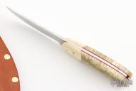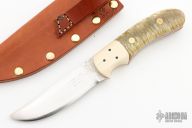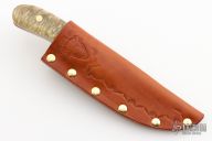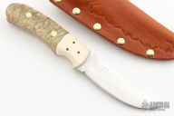 This skinner by Jim Whitman features a satin finish blade with jeweled ricasso, .141" blade thickness and 1.025" blade depth, full tang construction. The handle has dovetailed mammoth ivory bolsters, musk ox scales with red liners, brass and black pins. Comes with a brown leather sheath. Excellent condition. Comes with a COA.