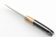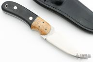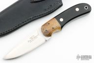 This hunter by Jim Whitman features a satin finish blade with jeweled ricasso, .131" blade thickness and 1.141" blade depth, full tang construction. The handle has dovetailed jaw bone bolsters, black linen micarta scales, stainless steel and black pins. Comes with a black leather sheath. Excellent condition.