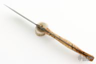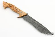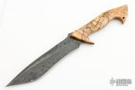 This Fighter by Alex Hossom features a Damascus blade with sharpened top edge, .162" blade stock and 1.611" blade depth, full tapered tang construction. The handle has spalted maple wood scales with mosaic pins. Comes with a zippered case. New from maker at the 2023 Blade Show.