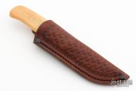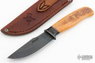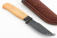 This EDC by James Behring features a blued and hammer marked blade with false top edge, .125" blade stock and 1.037" blade depth, hidden tang construction. The handle has a blued steel guard, fossil walrus ivory grip with wood/copper spacers. Comes with a hand tooled brown leather sheath and a zippered case. New from maker at the 2023 Blade Show.