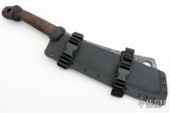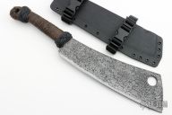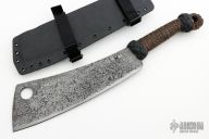 This Cleaver by James Helm features a hand forged clip point upswept blade with .269" blade stock and 4" blade depth, hidden tang construction. The handle has hemp wrap. Comes with a kydex sheath. New from Maker at the Atlanta Blade Show 2023.