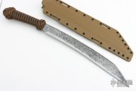 This Ginunting Chopper by James Helm features a hand forged wharncliffe recurve blade with swedge, .213" blade stock and 1.70" blade depth, hidden tang construction. The handle has black and brown paracord wrap. Comes with a kydex sheath. New from Maker.