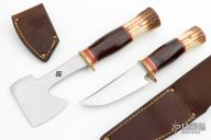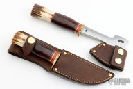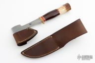 The Hatchet by Rocco Handmade features a satin finished covex ground blade with 0.188" blade stock and 2.75" blade depth, hidden tang construction. The handle has a brass guard, stacked horsehide leather grip with black/brass/red spacers. Vintage white tail stag pommel. 9.125" OAL. 10.1OZ. Comes with a brown leather sheath. Excellent condition.