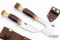 This Skinner by Rocco Handmade features a satin finished covex ground blade with 0.158" blade stock and 1.78" blade depth, hidden tang construction. The handle has a brass guard, stacked horsehide leather grip with black/brass/red spacers. Vintage white tail stag pommel. Comes with a brown leather sheath. Excellent condition.