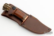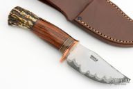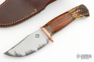 This Hunter by Rocco Handmade features a satin finished hollow ground San-Mai (416/1084) blade with .14" blade stock and 1.5" blade depth, hidden tang construction. The handle features a copper guard and spacers, black/micarta spacers, and an Ironwood grip and Sambar Stag butt with copper pin. Great look and feel. Comes with a Treeman brown leather sheath. New from maker.